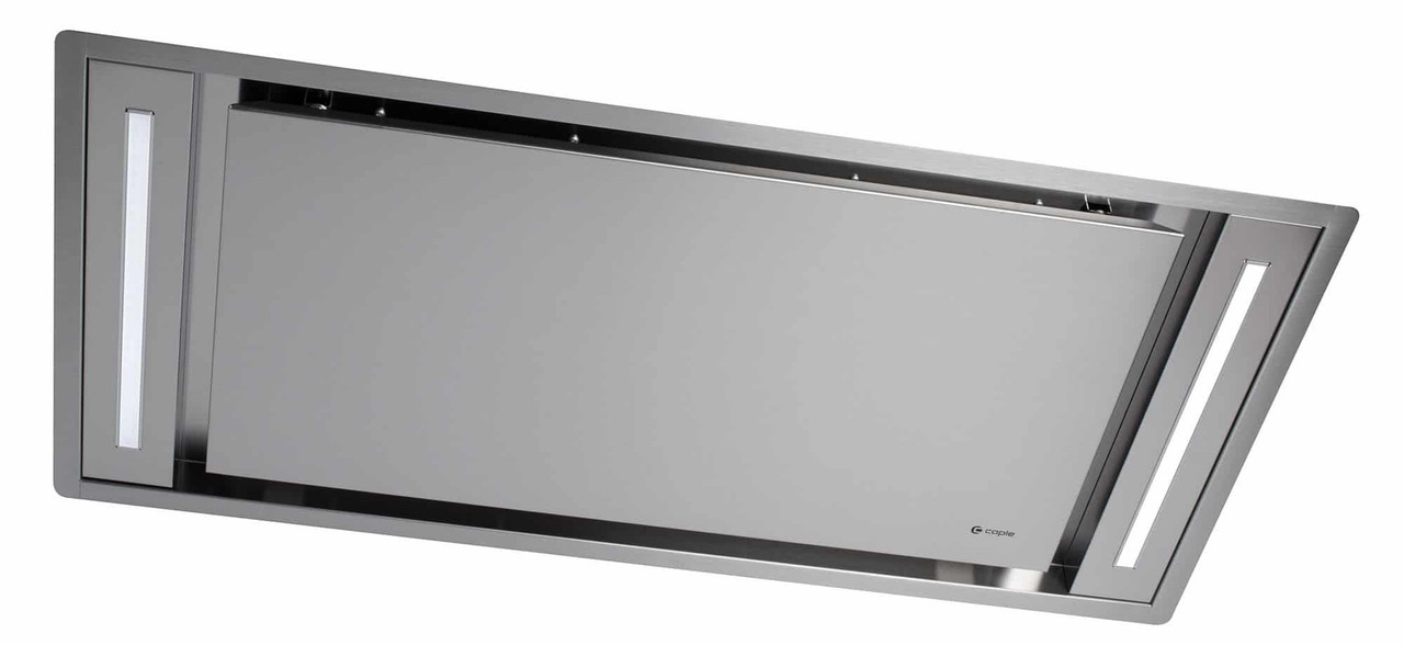 Caple CE903SS 90 cm Ceiling Cooker Hood in Stainless Steel brings premium extractor fan kitchen performance and a flush‑fit, minimalist design that integrates seamlessly into modern spaces. This ceiling‑mounted cooker hood extractor features a remote control and four speed settings including a boost function, so you can tailor airflow to match light or heavy cooking needs. Two 6.5 W dimmable LED light strips illuminate your hob area for improved visibility, and durable aluminium grease filters help trap grease for easier cleaning. It is designed for ducted installation only with a required 150 mm ducting size and uses perimetrical extraction technology to reduce noise and improve motor performance. The sleek stainless steel finish adds a refined look to any kitchen.